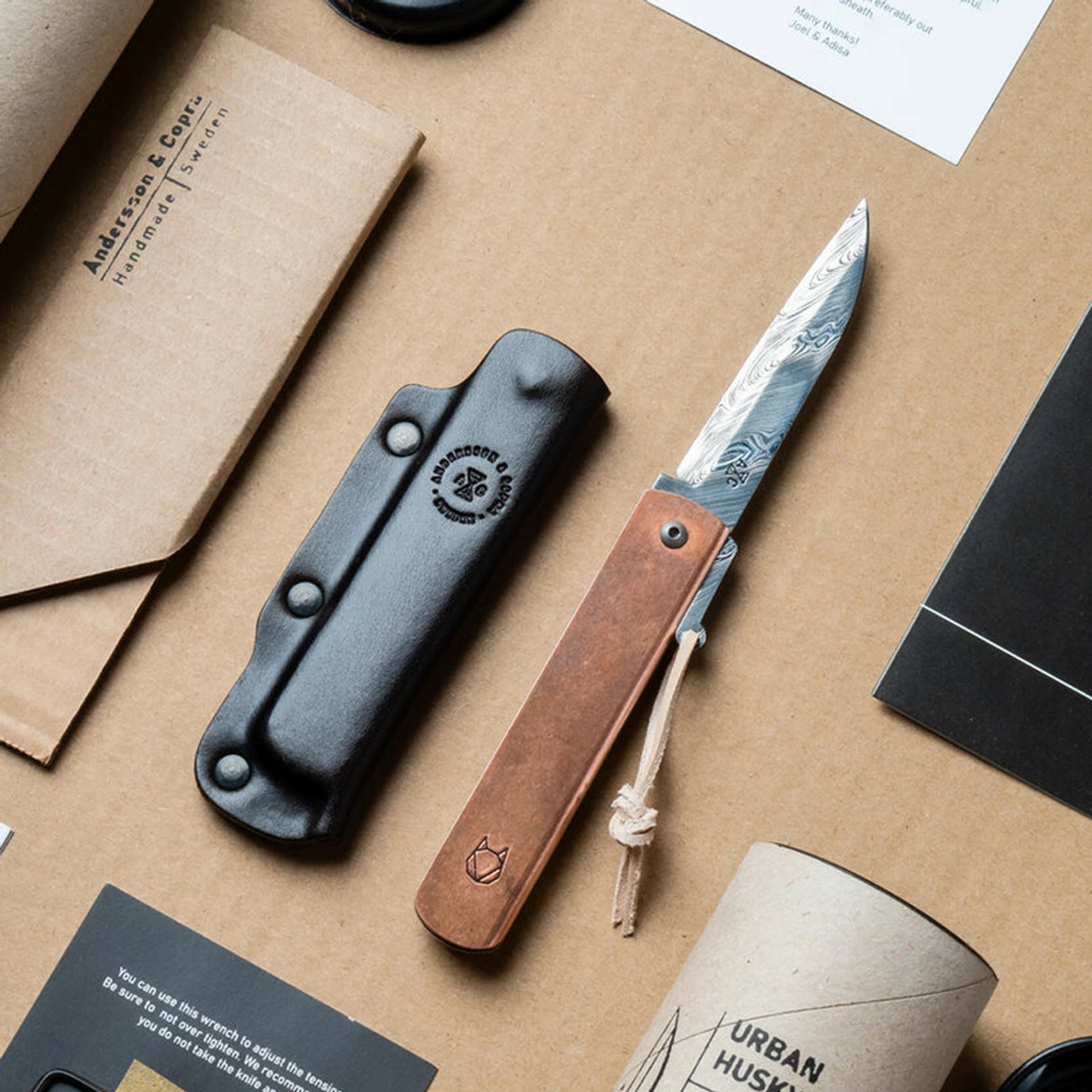 Andersson & Copra Urban Husky Friction Folder (ACDAMC) – 2.8″ Damasteel Damascus, Copper Handle with Leather Pouch