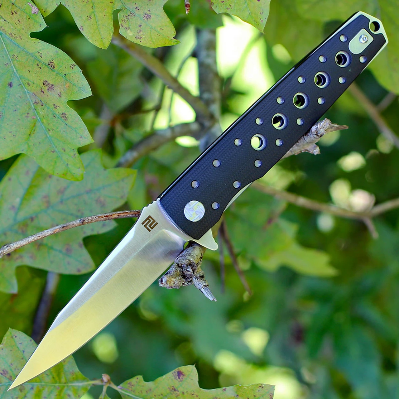 Artisan Virginia ATZ1807PBK, 3.94″ D2 Plain Blade, Curved Black G-10 Handle