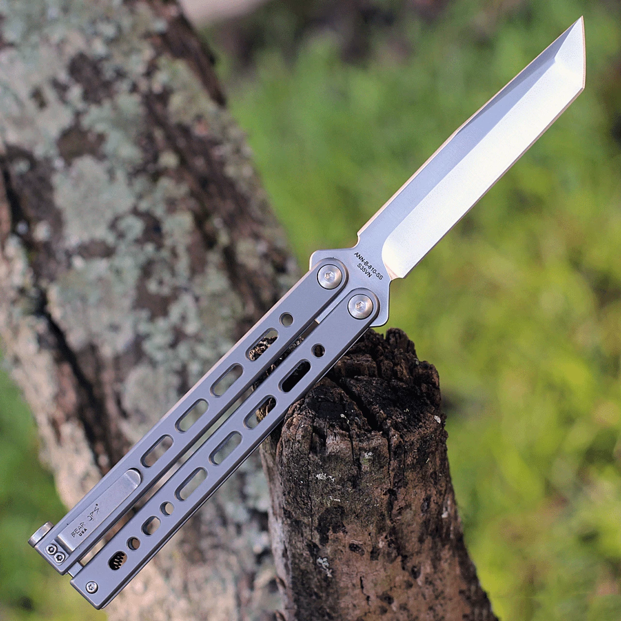 Bear & Son Cutlery 30th Anniversary Butterfly Knife – 4.9″ CPM-S35VN SS Embellished Satin Tanto Blade, Cerakote SS Handle – ANNB-810-SS-S35