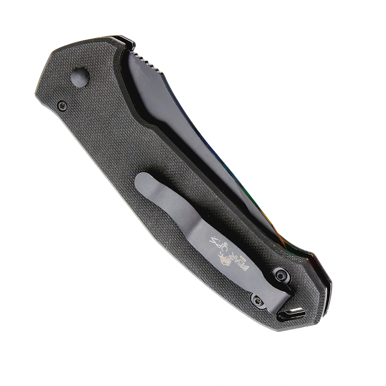 This model features a 3.75″ Sandvik stainless steel tanto blade with a black finish and jimping on the thumb ramp for added control. Its textured black/green G-10 scales offer a comfortable, secure grip while keeping carry weight on the lighter side. A sliding safety lock prevents misfiring, and allows safe storage. Includes a reversible stainless steel pocket clip for tip-up carry.