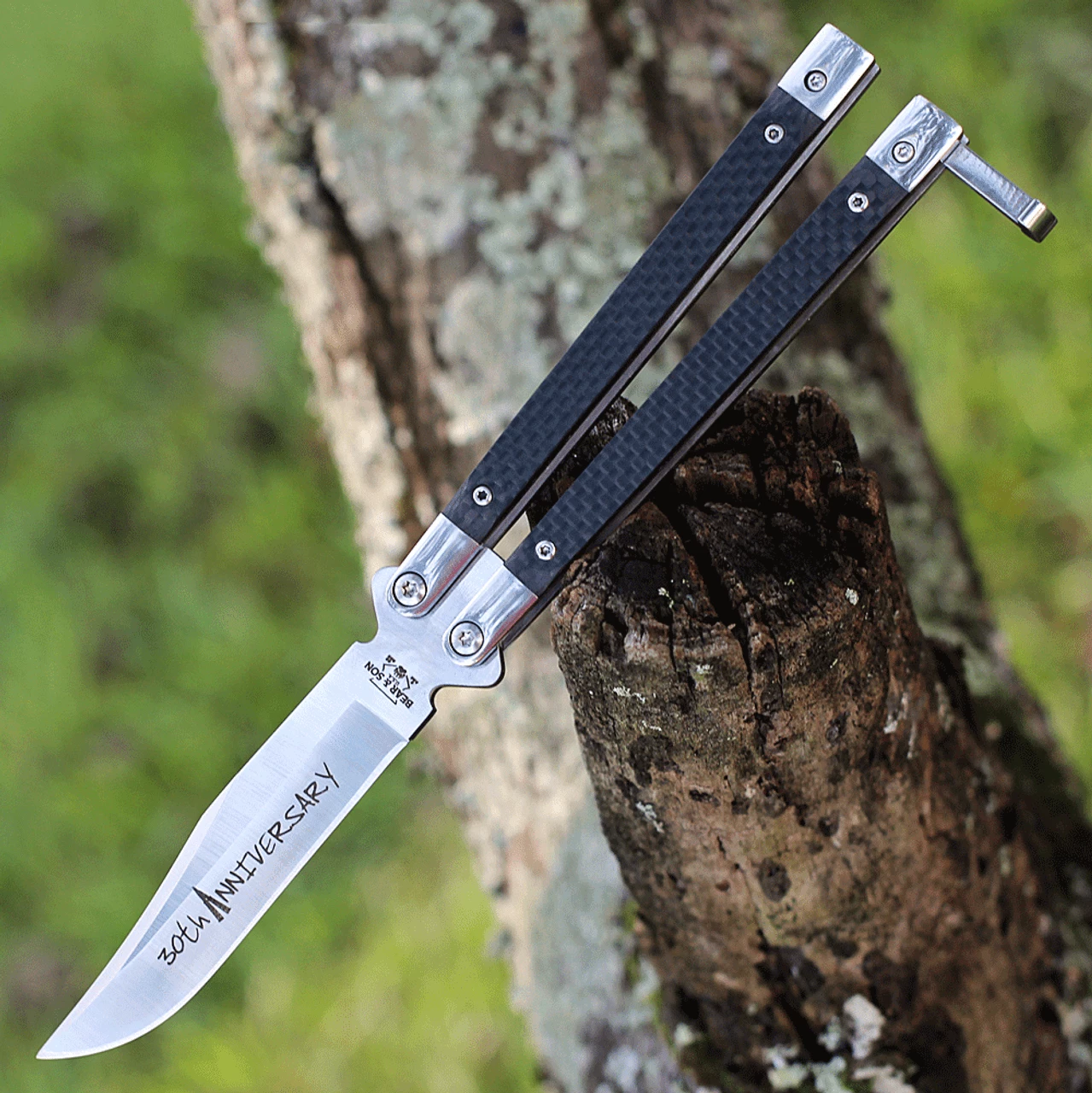 This Bear & Son 30th Anniversary butterfly knife features carbon fiber handles. The handle design reduces weight while adding additional tactile feedback while flipping. It has a stainless steel clip point blade with a plain edge and single tang pin with “30th Anniversary” engraved.