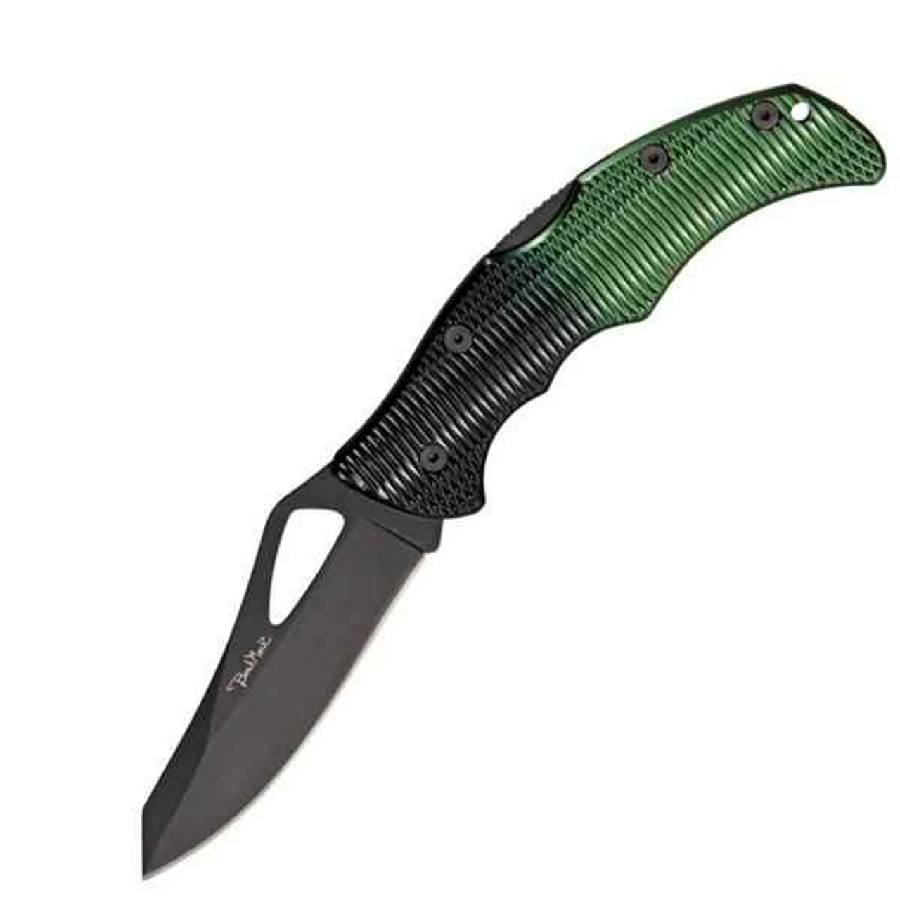 Benchmark Viper II Lockback. 4 7/8″ closed. 3 3/8″ black finish stainless blade with thumb slot. Textured black and green aluminum handles. Black finish stainless pocket clip.