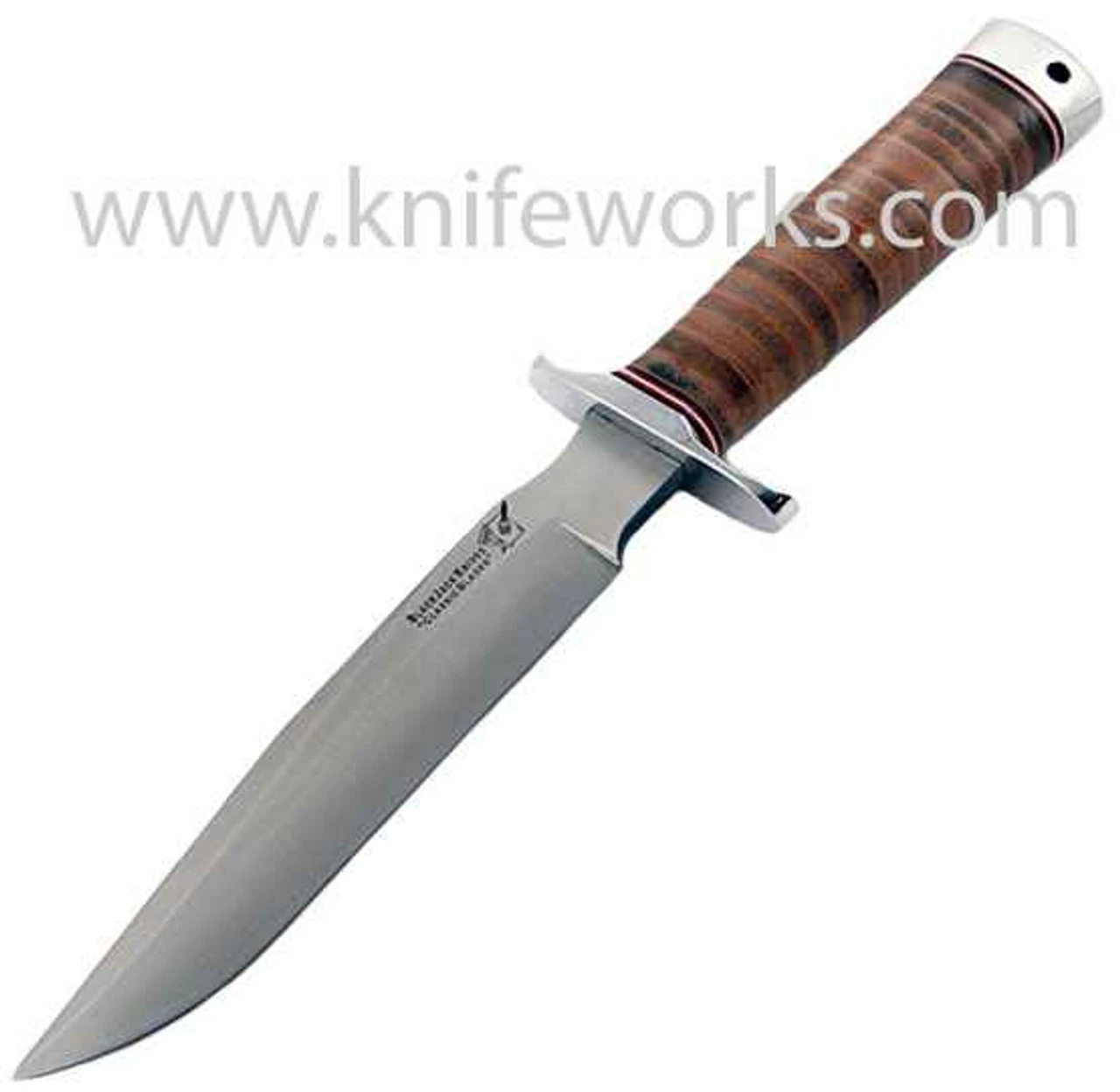Blackjack Classic Model 7. 12 1/4″ overall. 7″ A-2 tool steel blade. Stacked leather handle with aluminum guard and pommel. Genuine leather sheath. Made in USA. Blue Ridge Knives’ Exclusive.