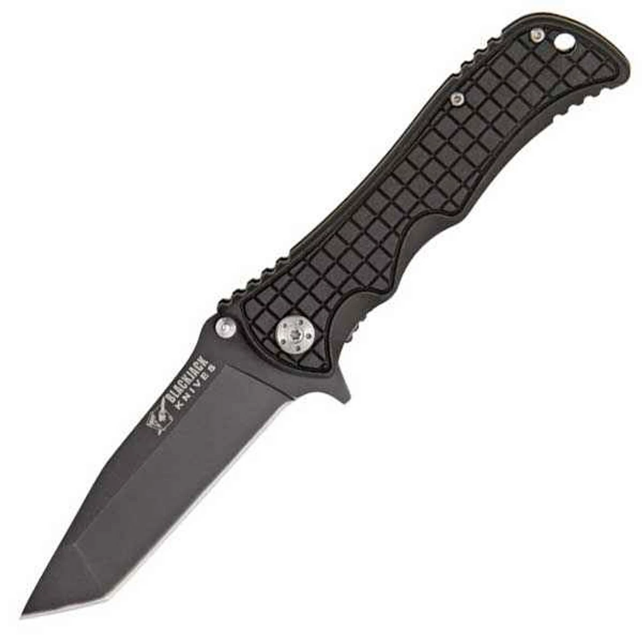 Blackjack International Model 1. 4 1/2″ closed linerlock. 3 1/2″ assisted opening black titanium nitride coated modified tanto blade with dual thumb studs. Black composition handles with block checkered design. Lanyard hole. Black stainless pocket clip. Designed by Darrel Ralph.