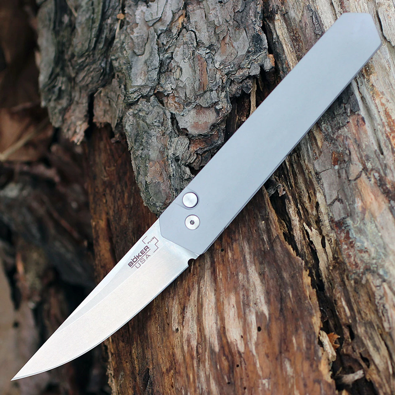 One of the most exciting projects over the last few years is this spectacular collaboration between three parties. Now, a new player joins the game, and together with Pro-Tech Knives, Boker and Lucas Burnley have lifted the Kwaiken folder to a whole new level. The 100% American-made Kwaiken Automatic combines the slim, minimalistic Kwaiken design with the perfect Automatic mechanism which only Pro-Tech is able to deliver. The perfect action of the push button automatic makes opening the Kwaiken a breeze, and the strong spring delivers an impressive kick when the blade locks open. The CNC-milled aluminum handle is robust and shows the same exciting Kwaiken design lines. The blade is made out of the U.S. made 154CM blade steel with two-tone finish, and provides high edge retention. Thus, the Kwaiken Automatic provides a completely new level in the Kwaiken series, and provides a unique, but versatile pocket knife suitable for many tasks. Includes pocket clip.
