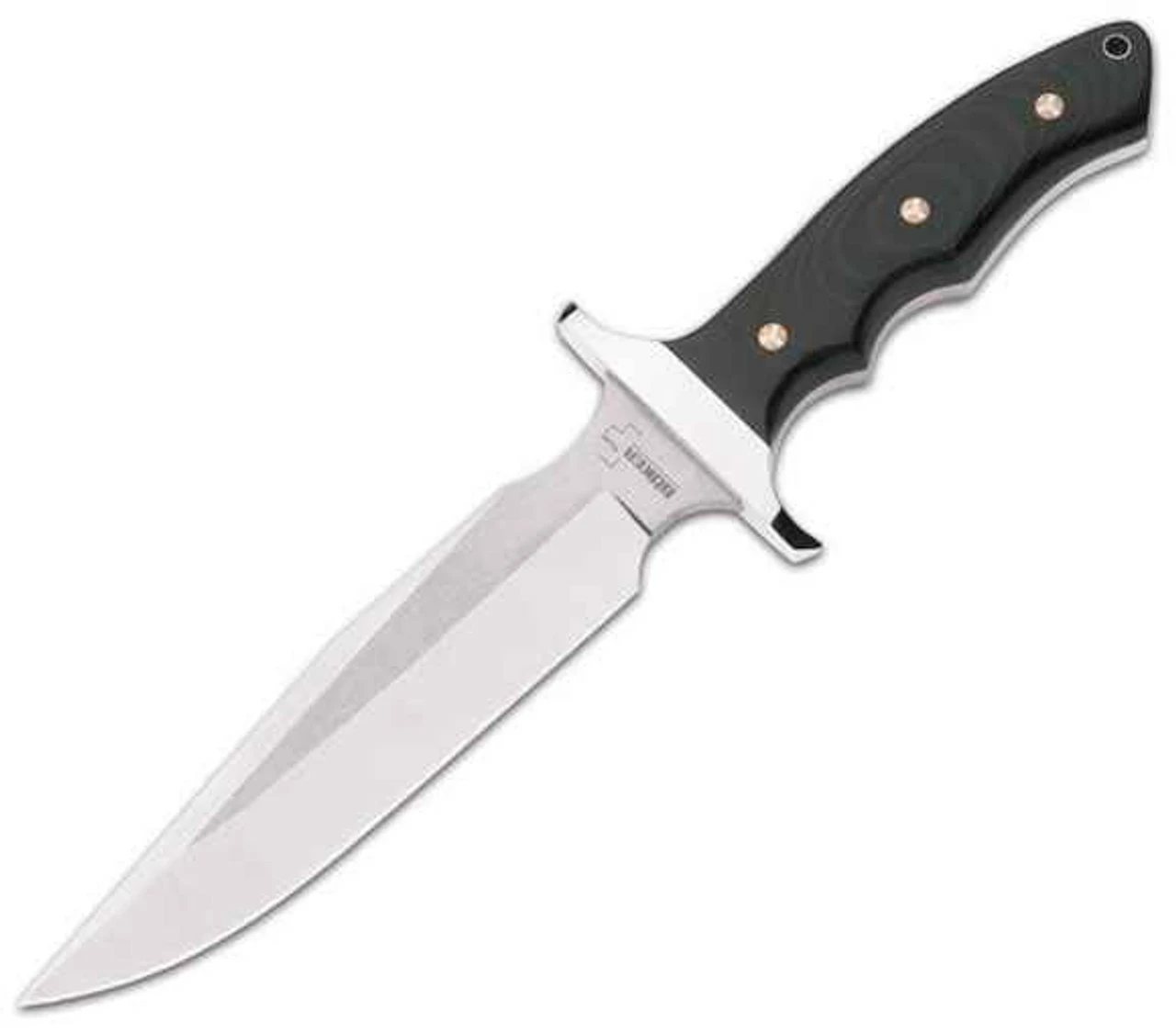 A modern interpretation of the classic Vietnam bowies, from Boker Plus. The blade features a satin finish going off into two different directions (for a two-tone finish), and in impressive thickness of 6mm, and is made of 440C stainless steel with excellent edge-holding capability. The crossguard is made of stainless steel and offers plenty of safety, even under rugged field use. The extensively ground Micarta handles are ergonomically shaped for a comfortable and secure grip, and contain a red fiber layer underneath. The handles are fastened to the tang by the use of mosaic pins, which are ordinarily only seen on custom knives due to costly production, and create a unique appearance. A must-have for the collector! With its approved concept and sturdy dimensions it can also be used as a reliable outdoor knife for a variety of cutting chores. Includes lanyard hole and premium genuine leather sheath.
