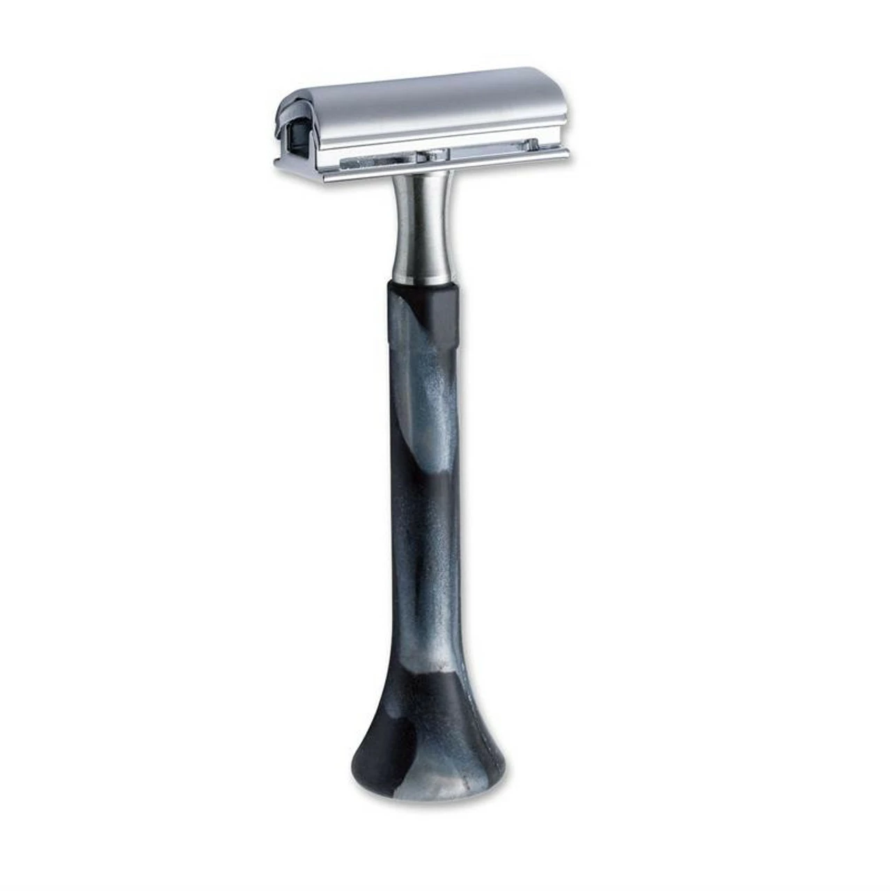 This Boker innovative safety razor offers a 4-edge double blade design and a patented double edge technology. The blades are contoured at a precise angle to deliver a perfect and smooth shave. The razor head is made of solid metal, is chrome plated, and automatically adjusts the blades. The ergonomically designed handle is 4″ long, and is available in a variety of materials. These razors are tested and approved by the National Institute for Cutting Tools and are 100% German manufactured. Each model comes with a set of 10 extra blades. Weight: 3 oz. With moisture resistant silicon handle, black and gray.