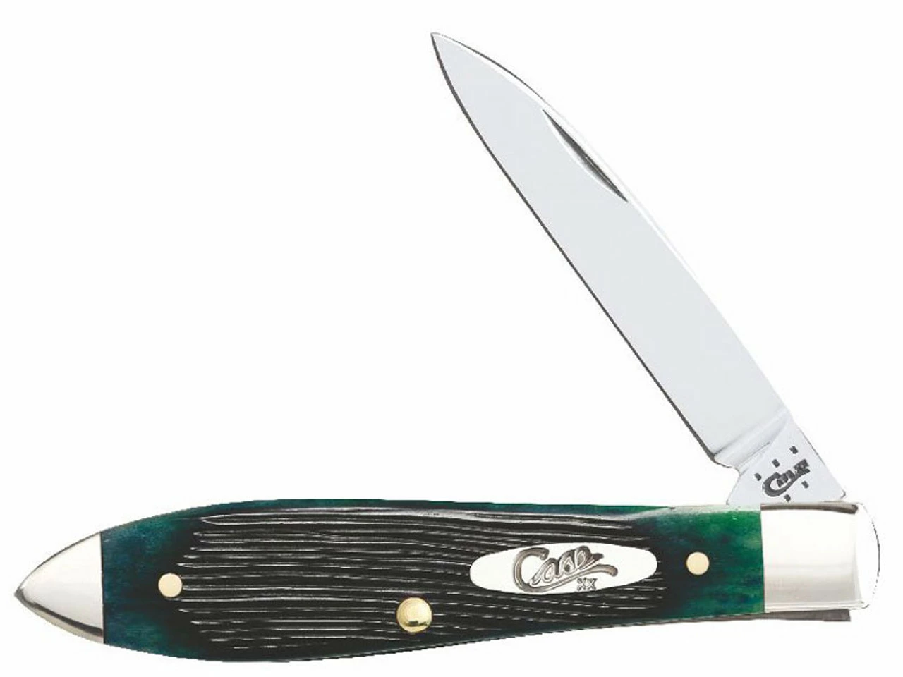 Resembling the look of a well weathered country barn, our Hunter Green Barnboard Jigged Bone Handle appeals to outdoorsmen and collectors alike. Beautifully blackened and adorned with a Case Oval Script Shield and Nickel Silver Bolsters, these trustworthy knives Tru-Sharp surgical steel bladesare ready for hard work.