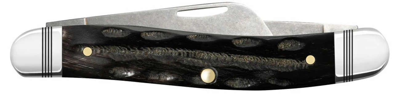 The Case Jigged Buffalo Horn Series offers superior quality stonewashed S35VN stainless steel blades with thumb hole in blades. The handles are made from premium black jigged buffalo horn, adding durability and style. Additionally, the brass pins and liners, ringed nickel silver bolsters, and color-filled nickel silver Case shield provide extra stability and a sleek look. Because natural materials are used, color and texture may vary. Proudly made in the USA.