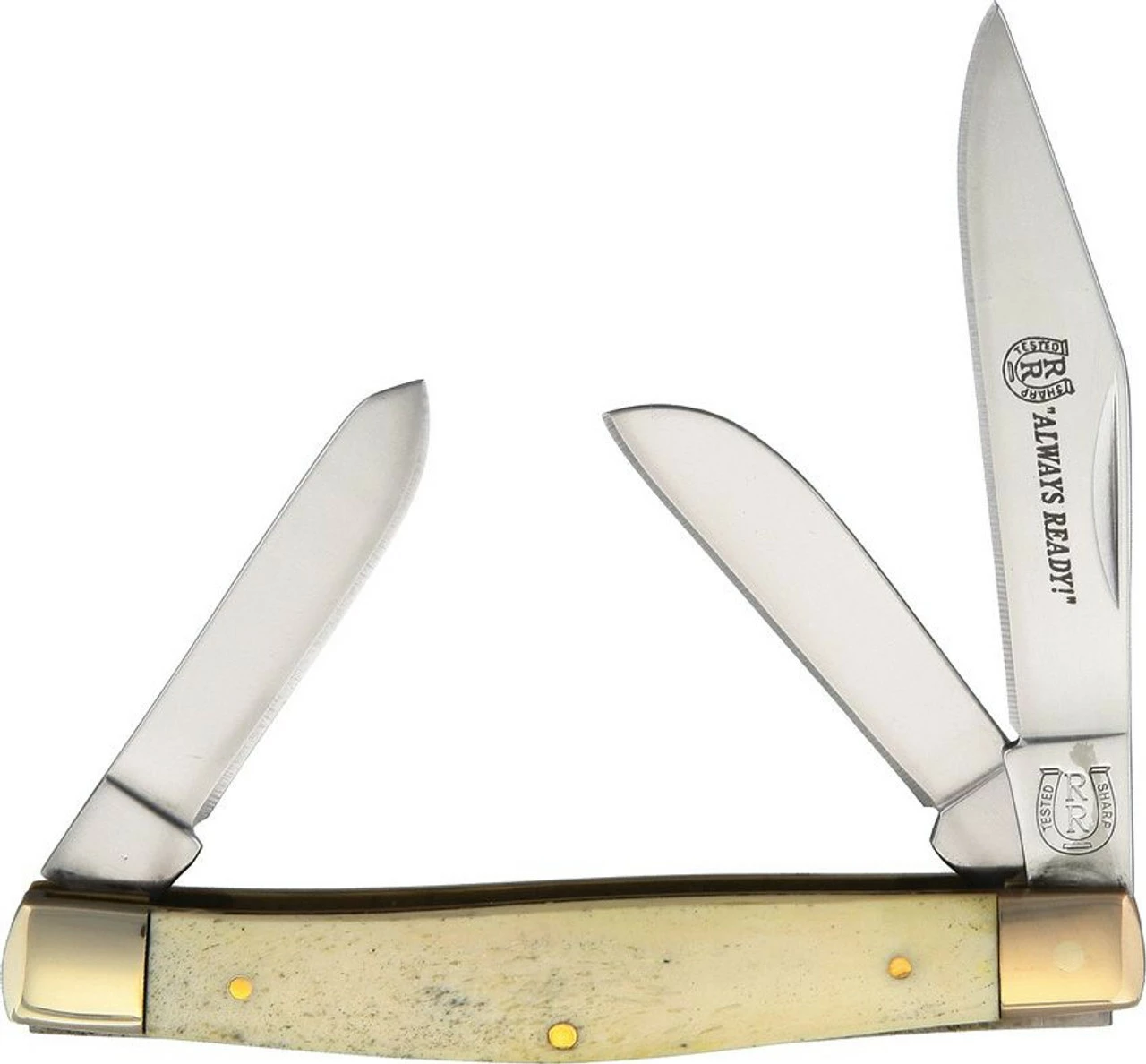 Rough Ryder Stockman (248) 2.62″ Clip, 1.87″ Spey, 1.87″ Sheepsfoot Mirror Polished 440A Plain Blades, White Smooth Bone Handle