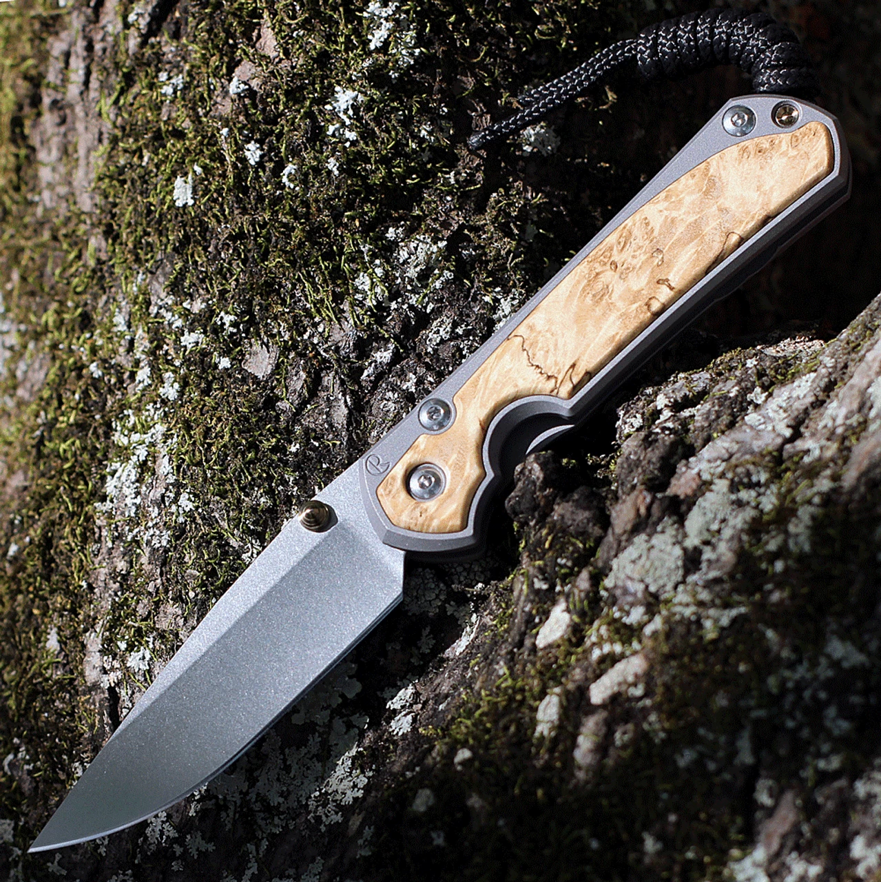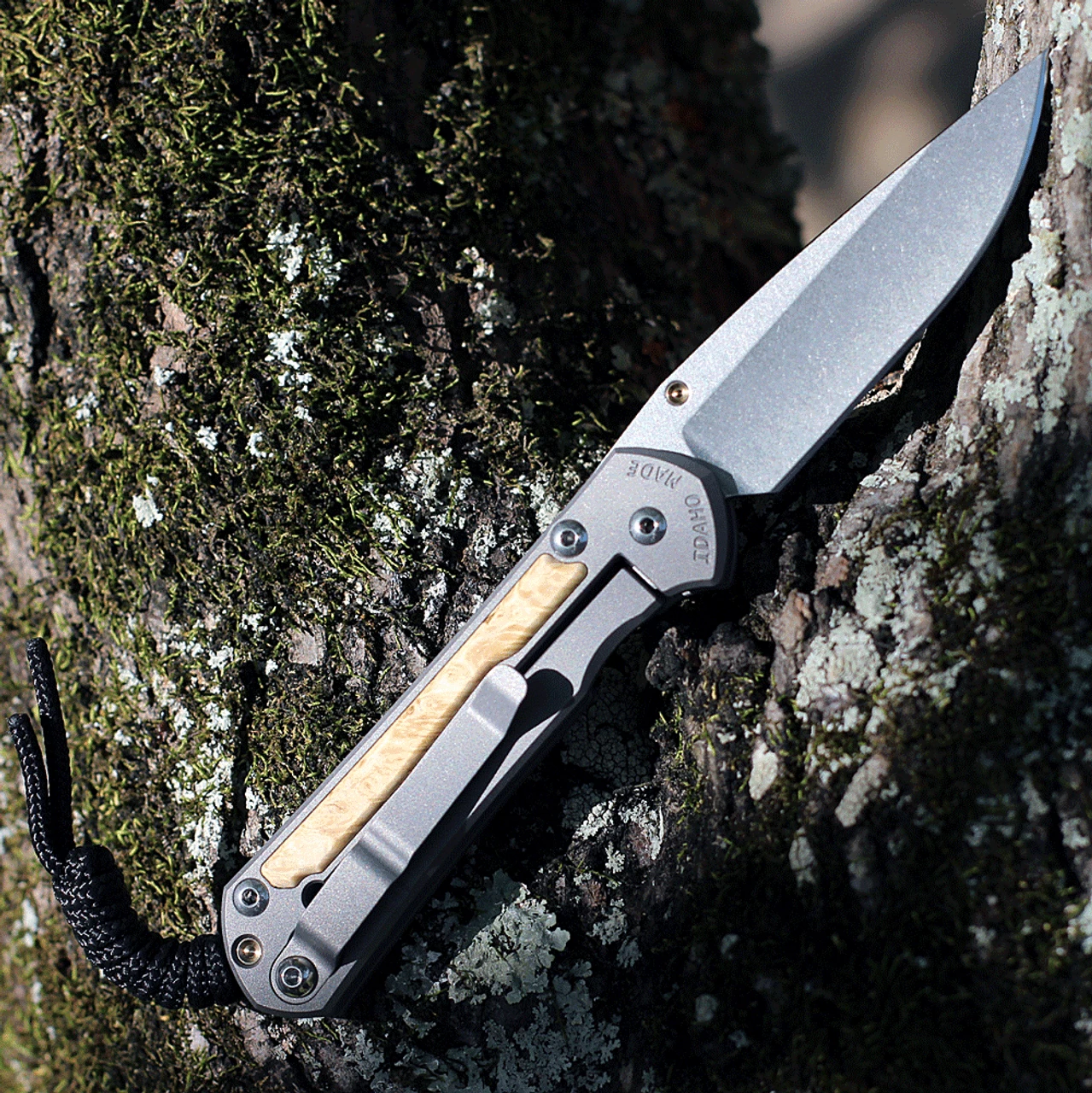 - 6AL4V Titanium Matte-blasted w/ Box Elder Burl Inlay Handles