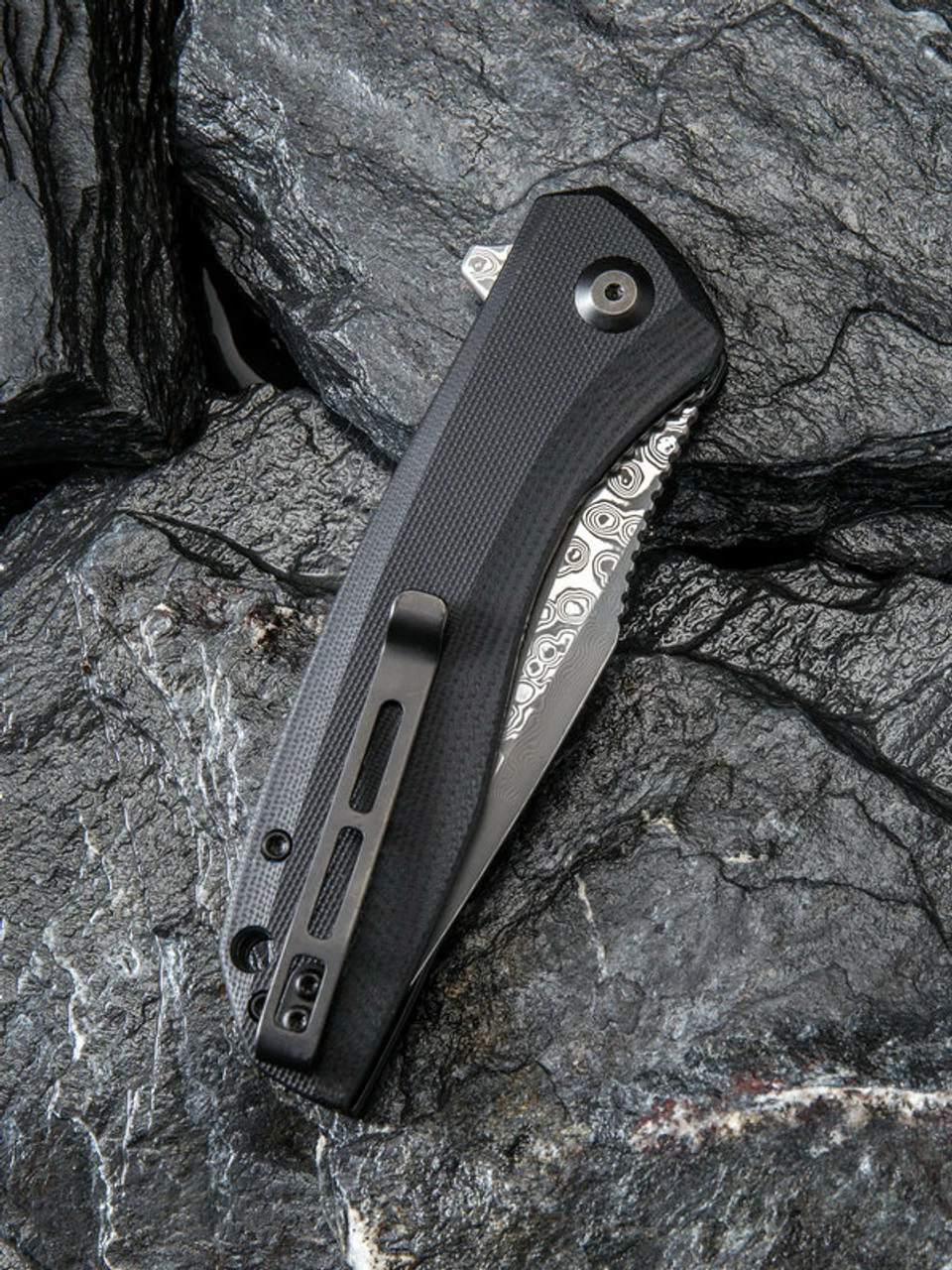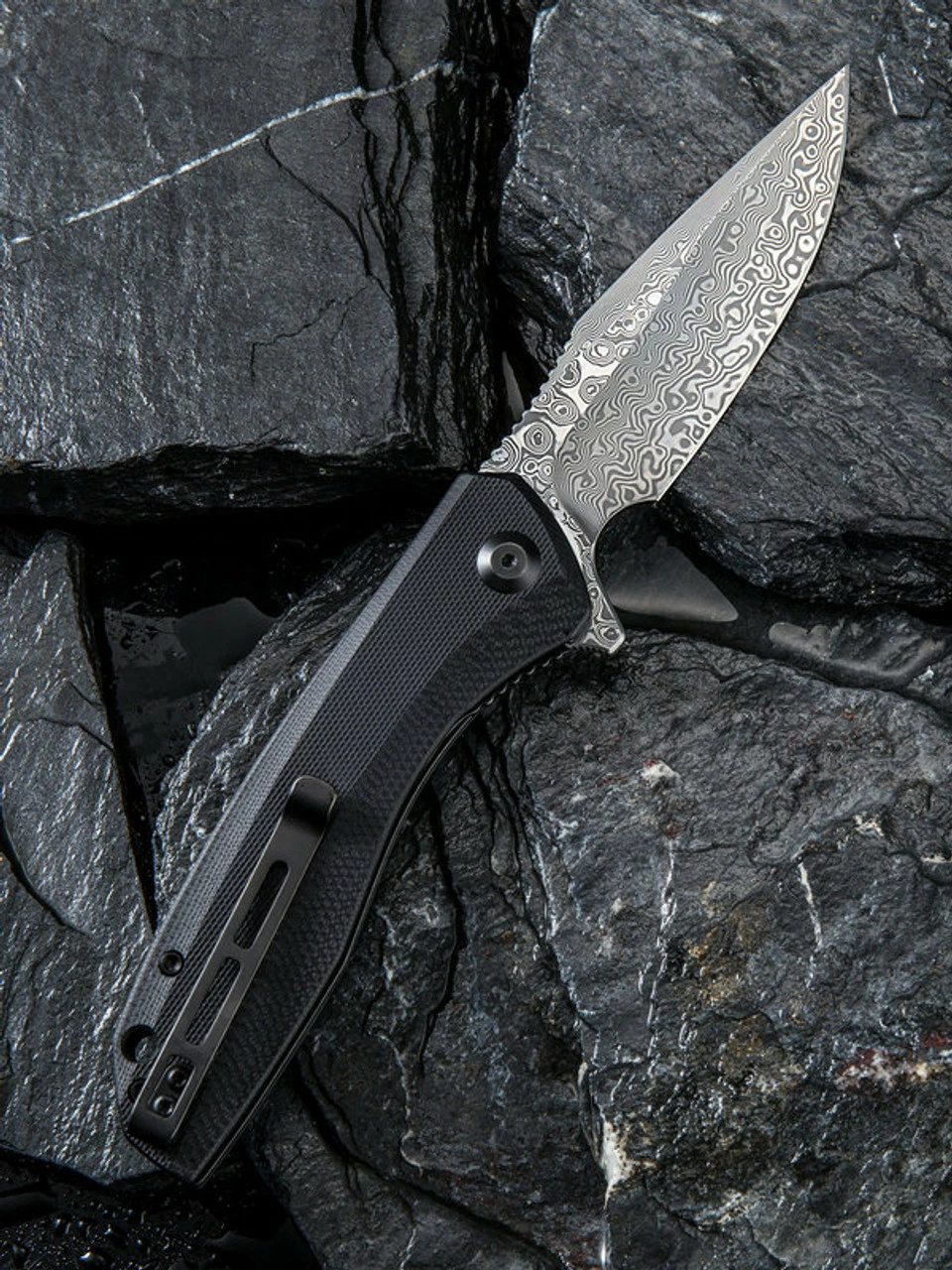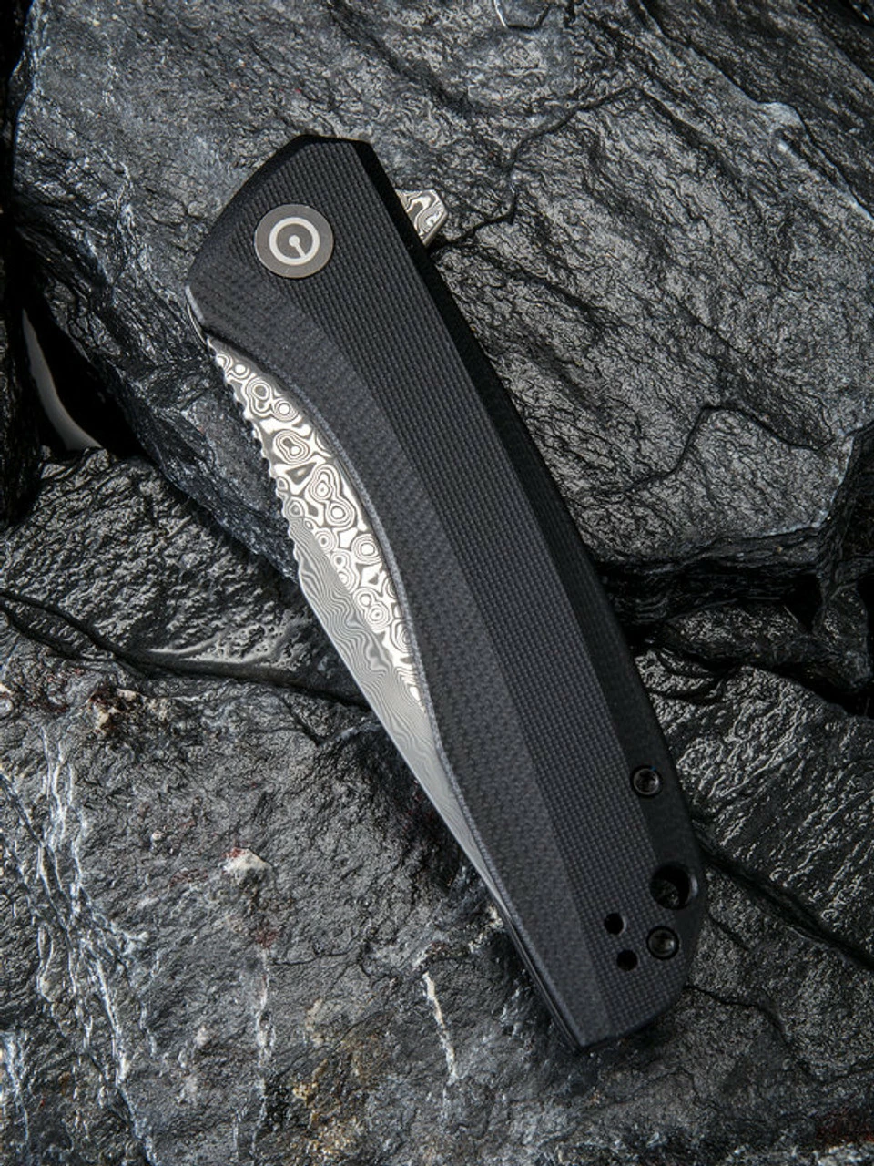 CIVIVI Baklash Folding Knife (C801DS)- 3.50″ Damascus Drop Point Blade, Black G-10 Handles