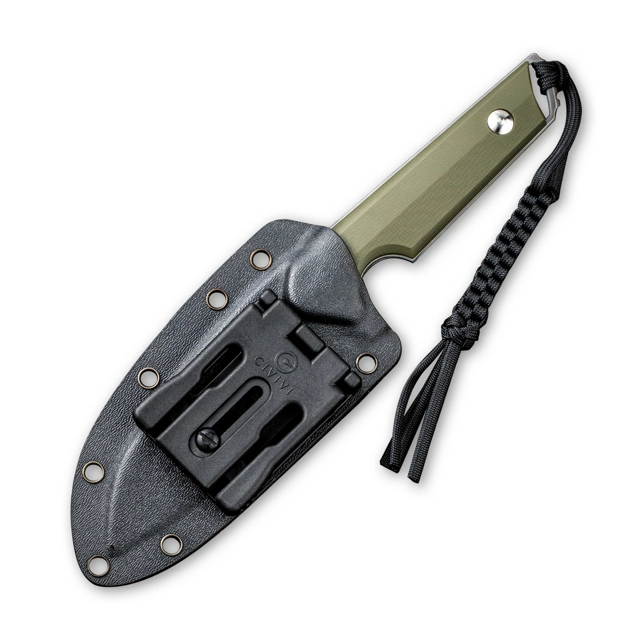 - Lanyard/lanyard hole and a black Kydex sheath.