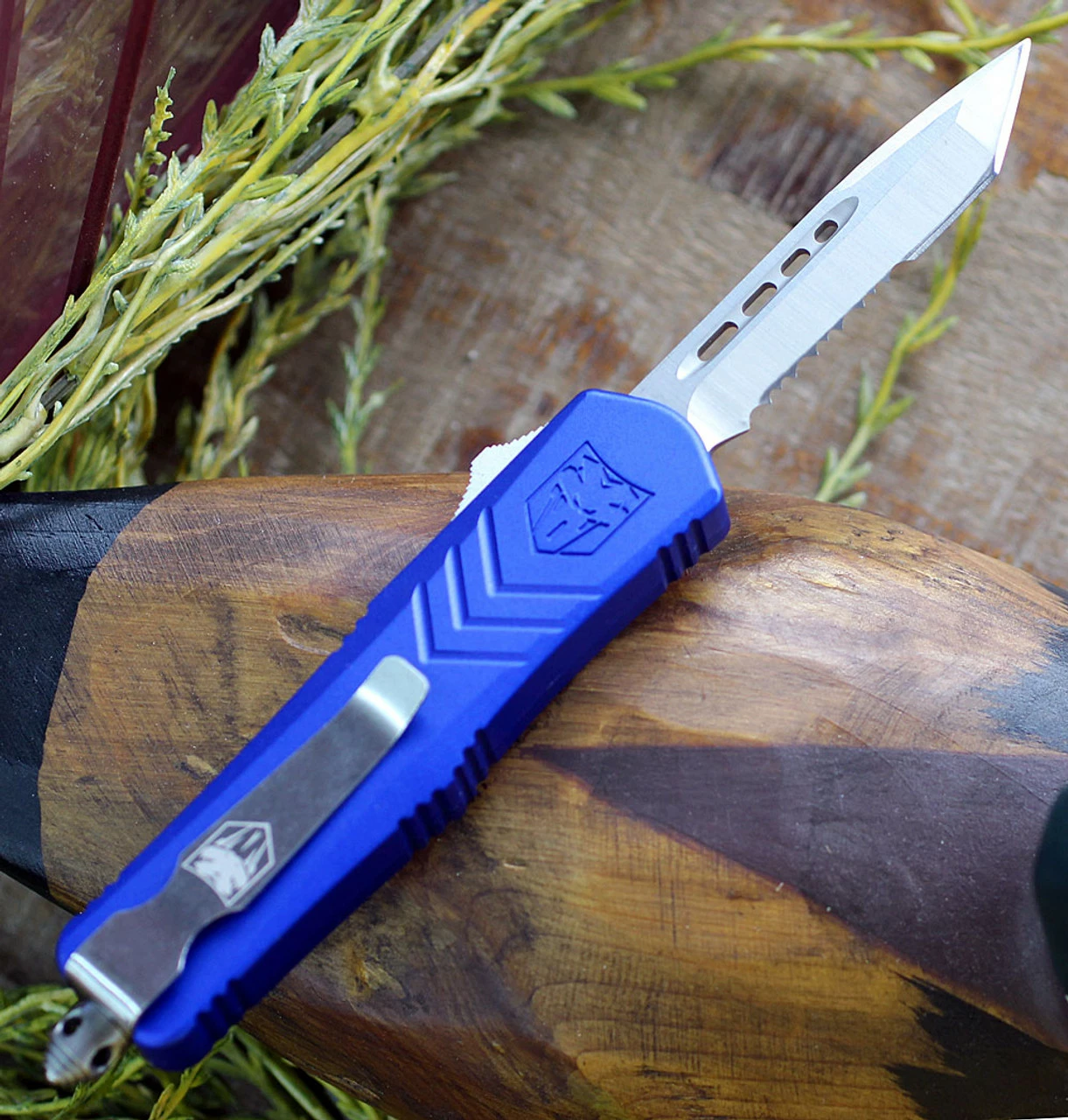 CobraTec Blue FS-X OTF Knife CTKSBLUFS-XSTS, 2.75″ D2 STeel Serrated Tanto Blade, Blue Aluminum Handle