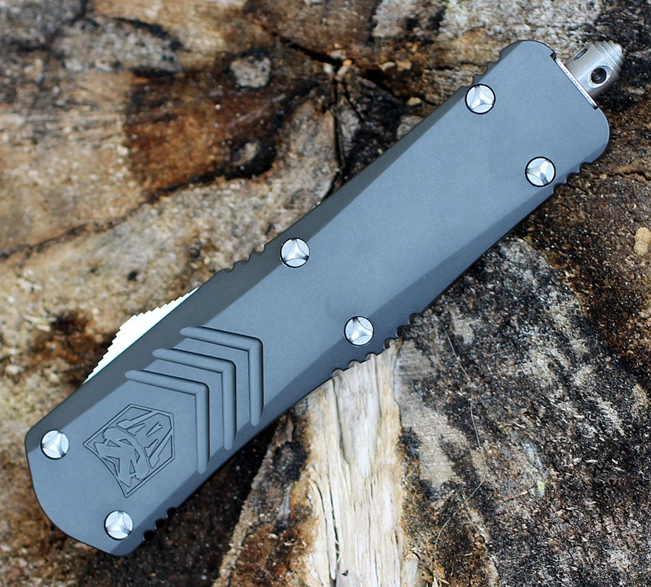 CobraTec Gray FS-X OTF Knife CTKMGRYFS-XMDAG1SS, 3″ D2 Steel Dagger Serrated Blade, Gray Aluminum Handle