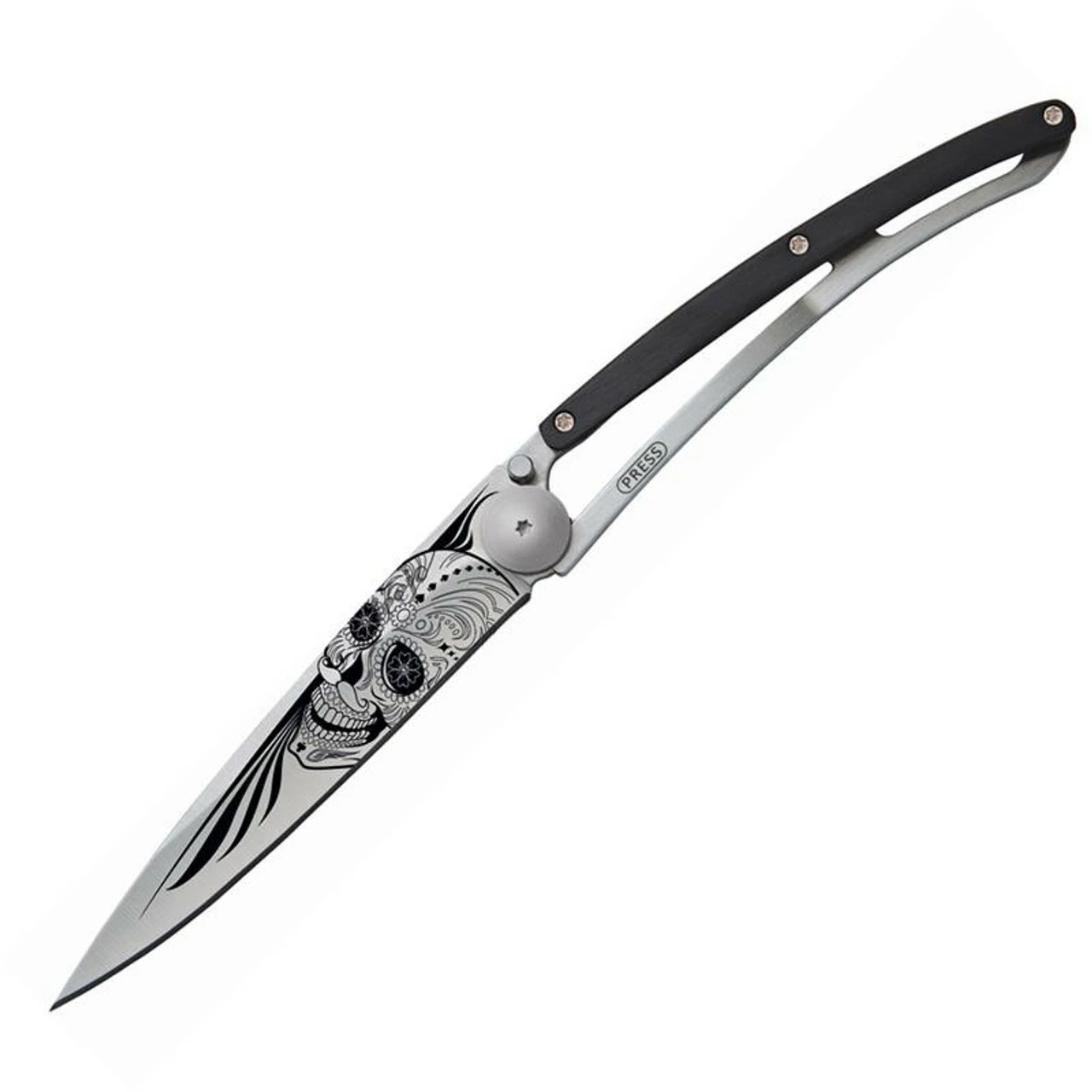 Deejo Latino Skull Granadilla 37g – 4 3/8″ closed framelock. 3 3/4″ 3Cr13 stainless blade with Latino Skull blade “Tattoo”. Hardened to 52-54 HRC. 2Cr13 stainless open designed frame with Granadilla Wood handles. Stainless pocket clip.