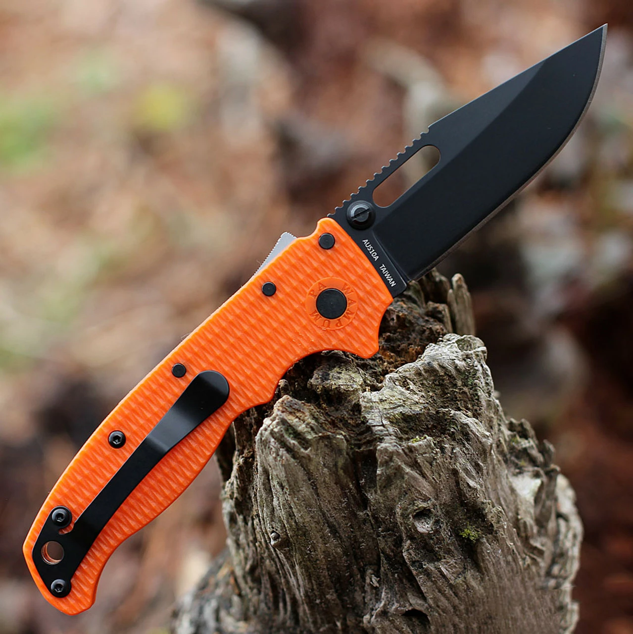 Demko Knives AD20.5 Shark Lock – 3.25″ AUS-10A Black Clip Point Blade, Orange Textured Grivory Handle