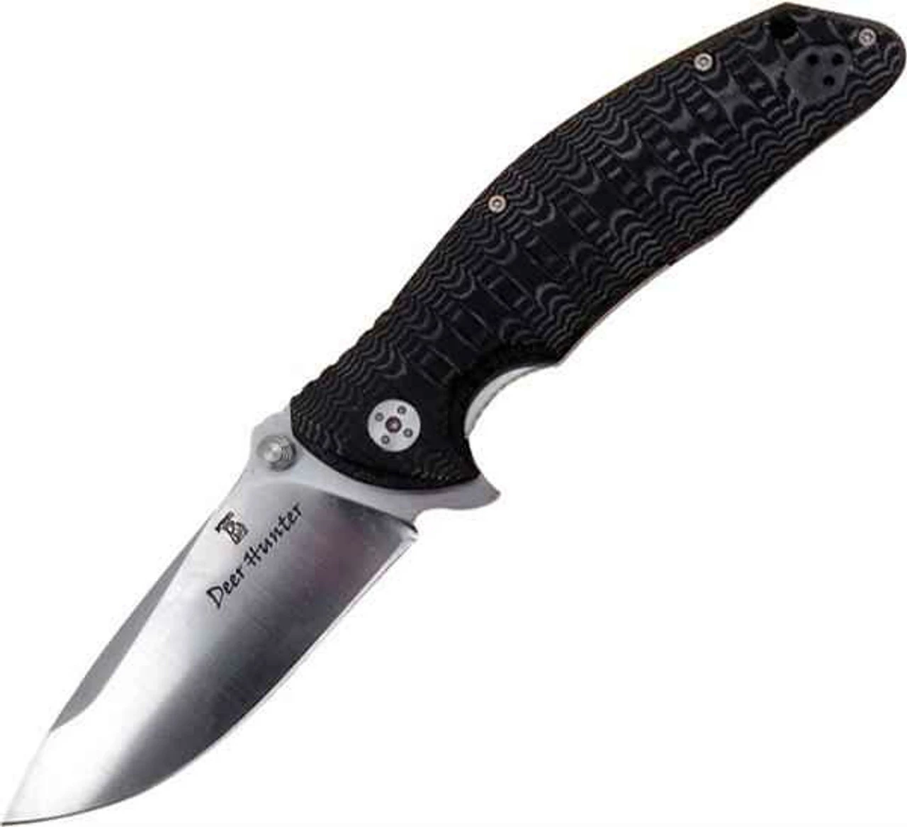 Dendra Deer Hunter. 8.85″ closed linerlock. 3.74″ D2 tool steel stonewash finish blade with dual thumb studs and extended tang. Hardened to 60-62 HRC. Micarta handles with 3D treatment. Lanyard hole. Stainless pocket clip. Made by Lion Steel