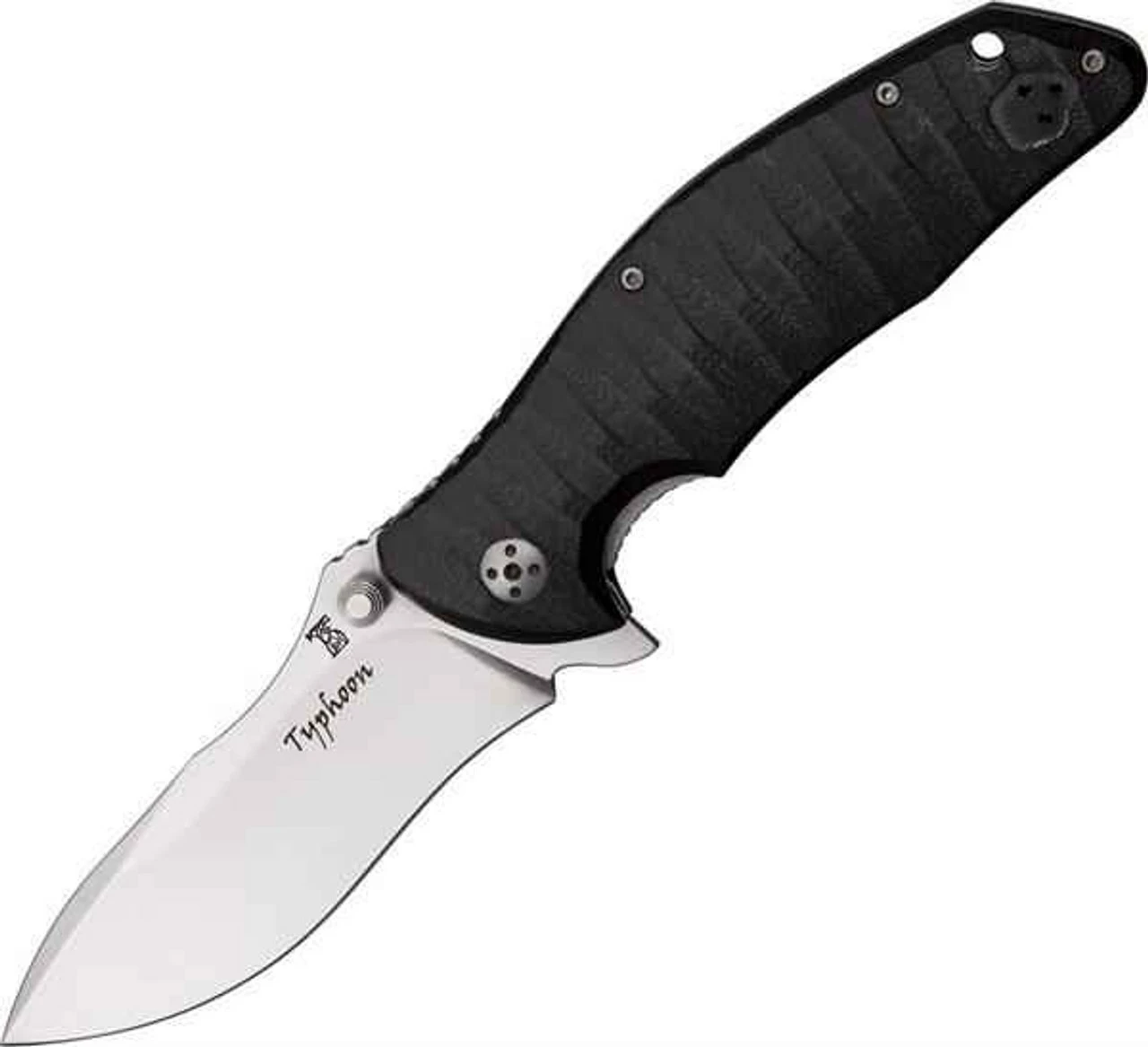 Dendra Typhoon. 8.85″ closed linerlock. 3.74″ D2 tool steel satin finish blade with dual thumb studs and extended tang. Hardened to 60-62 HRC. Black G-10 handles with 3D treatment. Lanyard hole. Stainless pocket clip. Made by Lion Steel