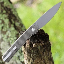 The handle scales are CNC-machined from black G10 high-pressure laminate aerospace composite. Compared to the original Mini-RSK® Mk1, it provides improved ergonomics. An “index bump” on the underside offers added security and comfort. The radial and checkered pattern machined into the surface combines effective grip with stunning esthetics. Ritter credits a fixed blade handle design by Les George on a Hydra Fighter he donated to Knife Rights’ Ultimate Steel 2015 fundraiser as inspiration for that motif. The handle is 0.16 inches (4 mm) longer to allow for the lanyard hole to be located at the tail end of the handle.